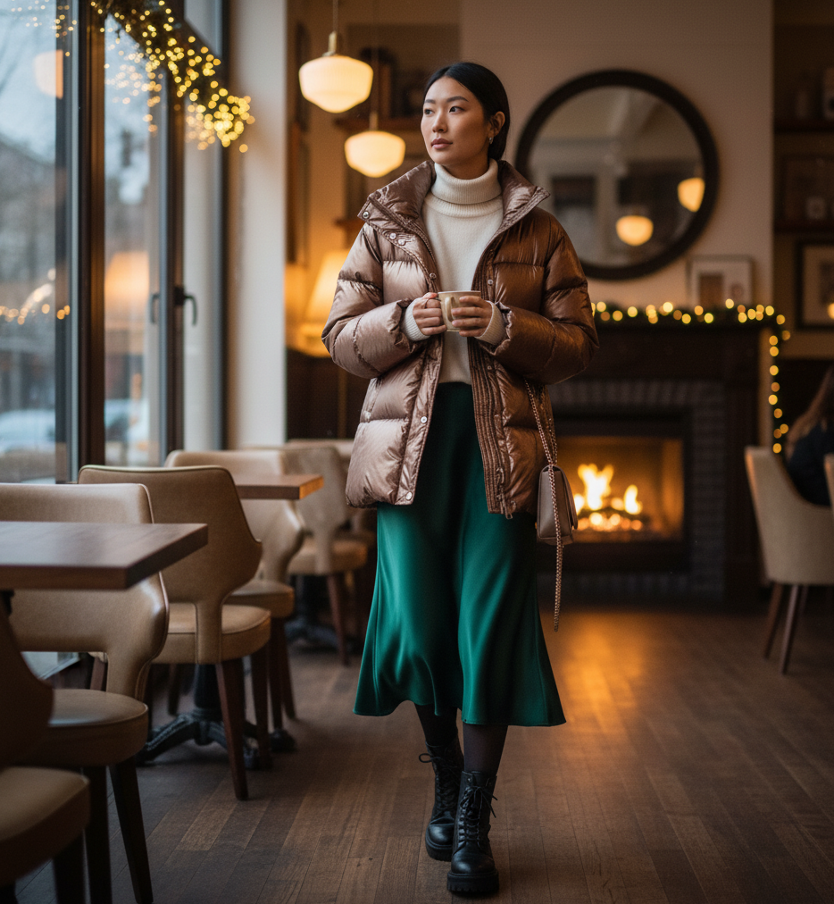 A fashion-forward puffer coat (maybe in a metallic finish or unexpected color) layered over a fine-gauge knit and a silk skirt. The contrast between casual outerwear and refined inner layers is key.